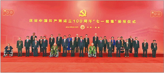 6月29日,庆祝中国共产党成立100周年“七一勋章”颁授仪式在北京人民大会堂金色大厅隆重举行。习近平等领导同志同“七一勋章”获得者合影。 新华社发