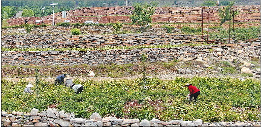 在刘嘉坤的车上,总是备着一双黑布鞋,是给自己爬山路准备的。今年64岁的他依旧精力充沛,爬山下山动作敏捷。在一处山顶,几辆推土机、挖掘机正在作业。挖掘机正将挖出的石块垒平,这一片片土坡从眼前铺展开去,隐入山间。看着眼前的景象,刘嘉坤充满了激情和干劲,“山上一共三台挖掘机,已经干了三年了,我们计划把荒山开出来,这样才能越做越大。”