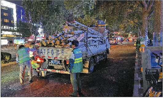 6月30日晚上8点半,历下园林的工作人员在清理树枝。
