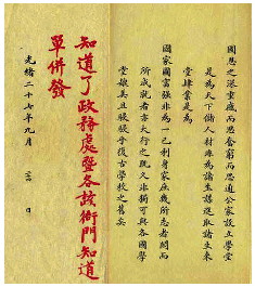 ▼1901年山东巡抚袁世凯上奏“山东试办大学堂暂行章程折稿”及光绪皇帝的朱批。