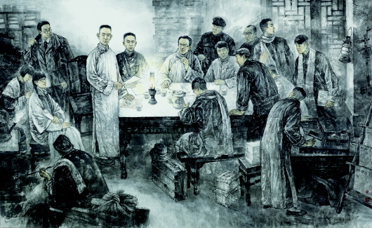 王磐德和周群沉浸在这历史的波澜中,犹如在漫漫长夜里望见指引革命方向的北斗,听见了于无声处的阵阵惊雷,令两位画家产生了极大的创作激情,决定选取王尽美、邓恩铭成立“济南马克思学说研究会”的重要史实,通过描绘众多在这段历史出场的人物形象和场景,艺术地再现这一历史的真实,从中撷取瞬间的画面。