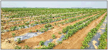 在白桥镇辣椒种植500亩核心示范区,农业物联网水肥药一体化全自动喷灌设备正式投入使用。如果采用大水漫灌,一人一天只能浇15亩地,这还是在水源充足的情况下,这种自动化喷灌机,喷灌半径14米,一小时可以喷灌200亩地。除了提高灌溉效率外,人工费用也节省了90%以上。过去浇地需要人全天盯靠在地头,现在只需要在家点选手机App,便可开启喷灌设备。