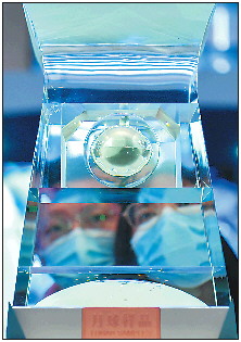 参观者在中国国家博物馆端详“月球样品001号”。 新华社发