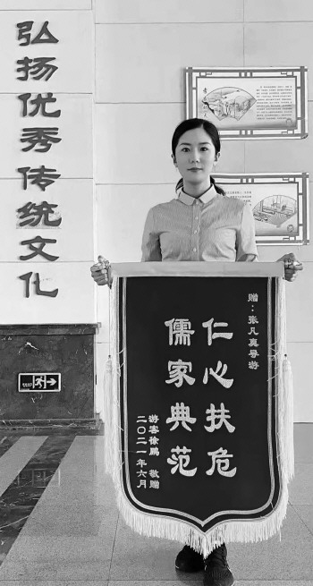7月9日,曲阜导游张凡真开始忙碌的导服工作,8天前收到的锦旗被曲阜孔子旅游集团导游公司挂在显眼的位置。除了锦旗,她还收到一封来自青岛于女士的表扬信,为她和导游公司的同事们及时救助丈夫点赞。