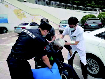 事发突然,程世栋迅速上前查看老人情况,并呼叫医护人员。此时正值午餐时间,医院餐厅位于停车场西北处,住院部就餐需穿行停车场,本准备去吃午餐的化疗一科李伟医师刚出住院楼便看到这一幕,立马飞奔过去,不忘交代楼门口体温监测点的护士李倩倩迅速准备便携氧气袋和抢救药品。