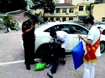 老人已经疼的在地上呻吟,情绪焦躁不安。李伟医师迅速查看老人的身体状态,初步判断老人是因为自身病情导致的胸闷憋气和身体钝痛,多体位无缓解憋气现象,此时护士李倩倩携带氧气袋和抢救药品赶到,两人配合将老人扶起呈半坐位靠在车门上吸氧并将老人的衣物从车上取下来盖在老人身上保暖,不断安抚老人。同时,程世栋已经用老人手机联系上正在住院处办理住院手续的老人的儿子,并得知车内有老人病历。