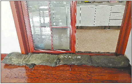 为了堵挡污水灌入客厅,庄先生不得已用上了防汛专用沙袋。