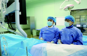 侯磊(右)与杨建(左)为患者进行介入治疗。