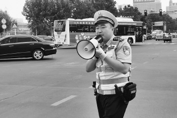 民警付尧对骑非机动车不戴头盔、不走人行横道等交通违法行进行“喊麦”劝导。