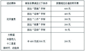 本次活动自2021年7月15日开始,8月13日结束。活动期间,购彩者凡在山东省体彩销售网点购买20元面值“花开富贵”、“大熊猫”、“中国范儿”或10元面值“十二星座”、“新时代 动起来”任意一款顶呱刮游戏,单张彩票满足下表所示条件,经销售网点终端“快速促销兑奖”模块扫描兑奖成功后,可获赠指定价值的即开票。具体活动内容如下: