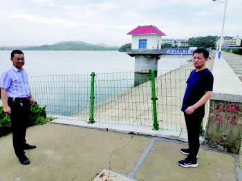 ▲图为派驻第二纪检监察组到米山水库检查大中型水库防洪防汛工作。