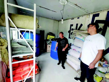 ▲图为文登区大水泊镇纪委到李家水库查看防汛物资储备情况。