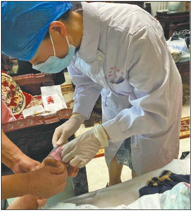 下午3时,医护人员到达患者小区,进门前按照工作流程规范着装、出示工作证、手卫生,并进行自我介绍,然后入户为患者服务。两名护理人员首先对老人情况进行现场评估等,仔细为患者选择合适材料进行伤口换药,并耐心为老人及家属讲解注意事项,受到患者家属的高度赞扬。一个小时后,服务结束,她们把医疗废物带回医院处置。在归途遭遇大雨冰雹恶劣天气,虽然路途比较艰辛,但给患者送去了温暖与关怀。