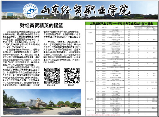 山东经贸职业学院是省属公办全日制普通高等学校,是全国供销合作社示范性高等职业院校、山东省首批技能型人才培养特色名校、全国国防教育特色学校,教育部“X+1”省东山、校院点试书证“2+3”级省、校院生招业专科本养培段分通贯口对“位单式园花”。