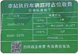 记者在充换电站门口看到,该站执行车辆超时占位收费,具体标准为:在0:00-4:59时段,4小时内免费,超4小时后12元;在5:00-23:59,1小时内免费,1小时后每20分钟4元,50元封顶。不过,充换电站的工作人员表示,如果是快充的话,新能源车一个半小时就能充满,所以绑定车牌后两个小时的免费时间基本能满足充电车辆的停车需求。