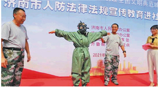 为普及防空防灾知识,倡导文明新风,提高人民群众的防空防灾意识和能力,营造创建全国文明典范城市的浓厚氛围,7月23日,济南市人防办在槐荫区刘庄桃园中心广场举办人防法律法规宣传教育进社区活动。
