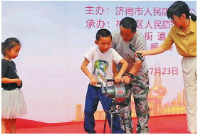 “防空警报分为预先警报、空袭警报、解除警报。”出于对新鲜事物的好奇,工作人员演示手动防空警报器的时候,有几位小朋友已经悄悄来到主席台上近距离观看。工作人员介绍,手摇警报器是根据手摇速度的快慢改变声音的大小,速度越快,声音越大。