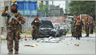 7月20日,阿富汗总统府附近遭多枚火箭弹袭击,安全人员查看袭击现场。 新华/美联