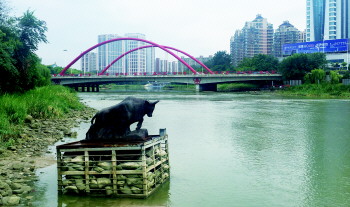 7月29日,在潍坊城区彩虹桥上记者看到,台风“烟花”过境后河道内水位并未有明显上涨。河道两岸大量岩石裸露,原本浸没在河水中的铁牛底座也全部露出了水面。虽然天空中依旧飘着小雨,但不时有人停下脚步拍照。