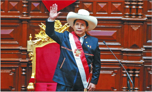 秘鲁当选总统卡斯蒂略当地时间28日在国会正式宣誓就职,任期5年。现年51岁的卡斯蒂略作为自由秘鲁党候选人,在今年6月6日举行的总统选举第二轮投票中击败人民力量党候选人藤森庆子,当选秘鲁总统。