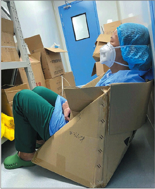 凌晨4点,在经过21个小时的样本接收工作后,身体与精神双重疲惫的她,在样本工作量稍微小了的时候,在储物间蜷缩在小小的纸壳箱里睡着了。“本来想把她叫起来找个舒适的地方睡会儿,但看到她睡得那么香,我们实在没忍心打扰。”拍下照片的同事向记者说道。