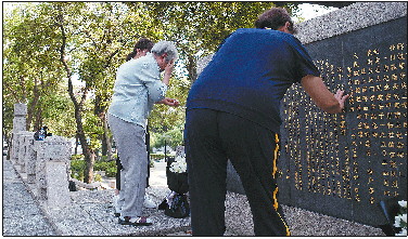 当天下午,在中山公园的革命烈士纪念碑前,举行了一场简洁庄重的祭拜仪式,家属在纪念碑前为烈士献上了花圈。在刻有郑克昌烈士名字的石碑上,郑桂芬与郑秀美用纸巾一再擦拭后,向烈士行了大礼。郑桂芬说,这次祭拜尽管迟了七十年,但终究还是完成了。