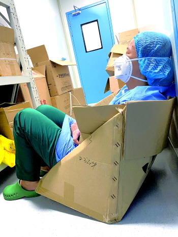 凌晨4点,在经过21个小时接收样本工作后,身体与精神双重疲惫的她,在样本工作量稍微少了的时候,在储物间蜷缩在小小的纸壳箱里睡着了。“本来想把她叫起来找个舒适的地方睡会儿,但看到她睡得那么香,我们实在不忍心打扰。”拍下她照片的同事说道。