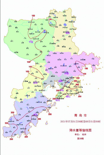 青岛市2021年7月1日6时至8月1日6时降水量等值线图。