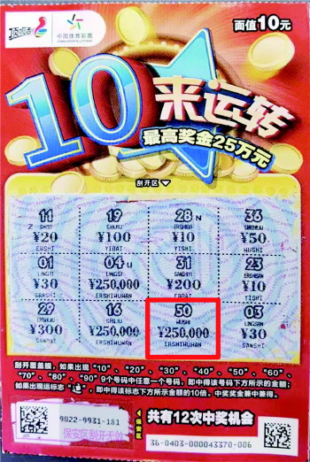 近日,山东平度购彩者喜中顶呱刮10元面值彩票“10来运转”头奖25万元。