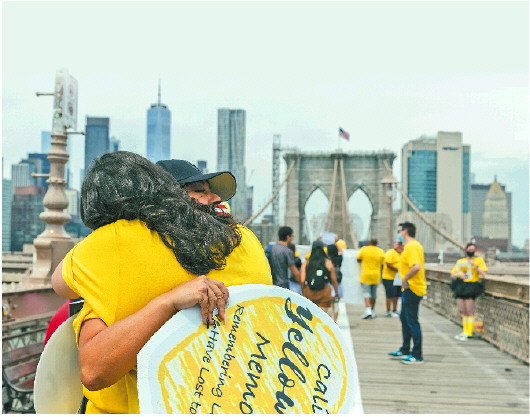 8月7日,参加纪念新冠逝者游行的人们在美国纽约布鲁克林大桥上相互拥抱。 新华/美联