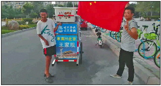 近日,在菏泽市人民北路,有一名男青年拉着一辆车,上面印有“读万卷书,行万里路,阜南——北京的车子”字样,引起路人围观,大家都纷纷拿出手机拍照、拍视频。青年人手里拉着只带有两个轮子的手拉车,车上坐着一位看起来行动不便的中年人,这究竟是怎么回事?齐鲁晚报·齐鲁壹点记者决定一探究竟。