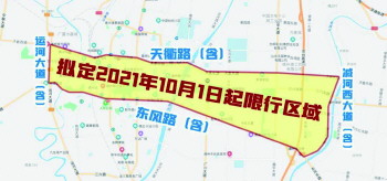 限行区域则分两步进行:第一步,自2021年10月1日起,减河西大道(含)以西、运河大道(含)以东、东风路(含)以北、天衢路(含)以南的区域限行;第二步,自2021年12月1日起,减河西大道(含)以西、运河大道(含)以东、南外环(不含)以北、北外环(不含)以南的区域限行。限行区域内,每日6时至20时禁止通行和路内停放。