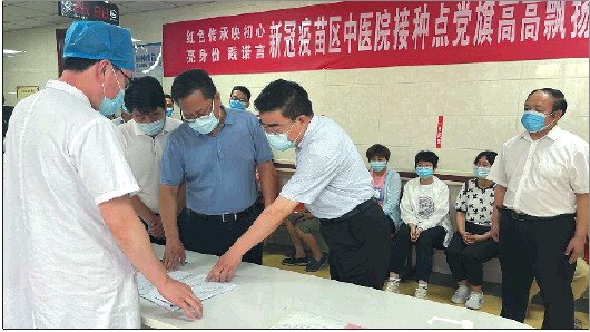 ◥长清区委书记赵居安(左三)到区中医医院督导检查疫情防控及疫苗接种工作。