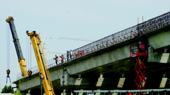 工人正在进行上部立交桥部分施工。
