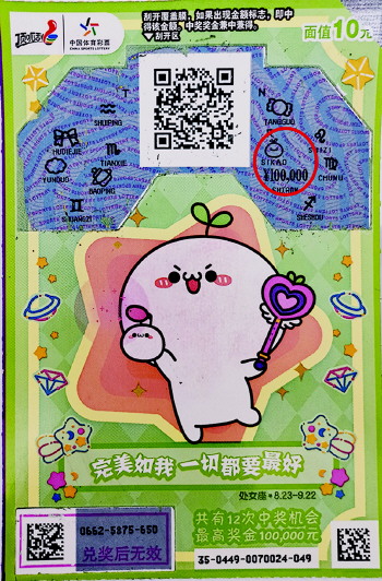 8月7日中午,钱大叔想起自己有几天没有玩顶呱刮了,一时技痒,随即到常去的体彩站刮票。“我也没有挑,直接从那站里挂着的彩票瀑布上撕下来几张,后来才看清楚原来当天刮的是‘十二星座’”。前两张都没有中奖,当刮到第三张时,他隐约觉得中奖了:“哎,这是10000吗?不对,怎么1后面是5个0,哎呦!这是中了100000元,一等奖呀!”