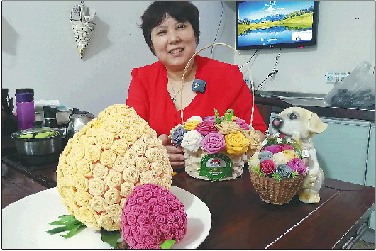 徐海霞制作的“煎饼花”以及花篮市场销路很好。