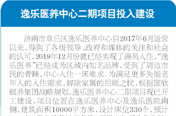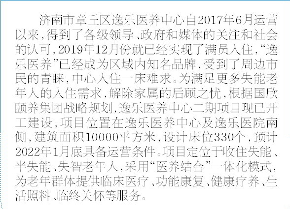 济南市章丘区逸乐医养中心自2017年6月运营以来,得到了各级领导、政府和媒体的关注和社会的认可,2019年12月份就已经实现了满员入住,“逸乐医养”已经成为区域内知名品牌,受到了周边市民的青睐,中心入住一床难求。为满足更多失能老年人的入住需求,解除家属的后顾之忧,根据国欣颐养集团战略规划,逸乐医养中心二期项目现已开工建设,项目位置在逸乐医养中心及逸乐医院南侧,建筑面积10000平方米,设计床位330个,预计2022年1月底具备运营条件。项目定位于收住失能、半失能、失智老年人,采用“医养结合”一体化模式,为老年群体提供临床医疗、功能康复、健康疗养、生活照料、临终关怀等服务。