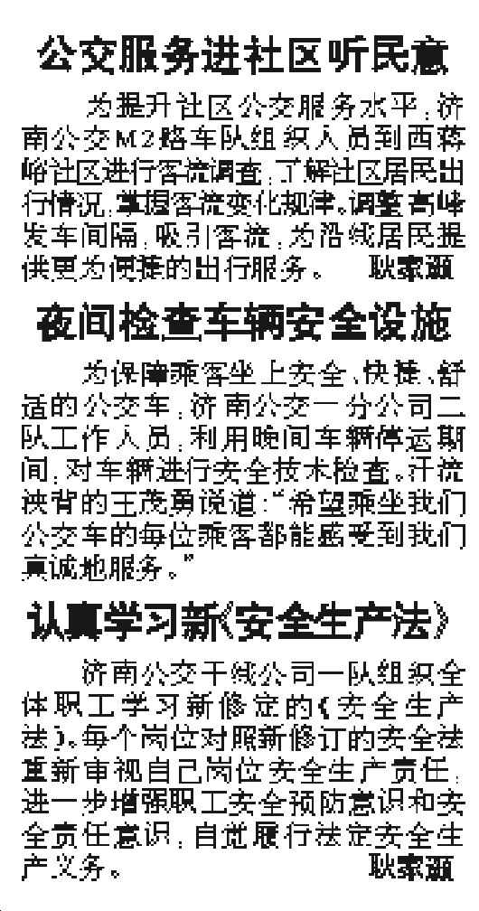 济南公交干线公司一队组织全体职工学习新修定的《安全生产法》。每个岗位对照新修订的安全法重新审视自己岗位安全生产责任,进一步增强职工安全预防意识和安全责任意识,自觉履行法定安全生产义务。 耿家灏