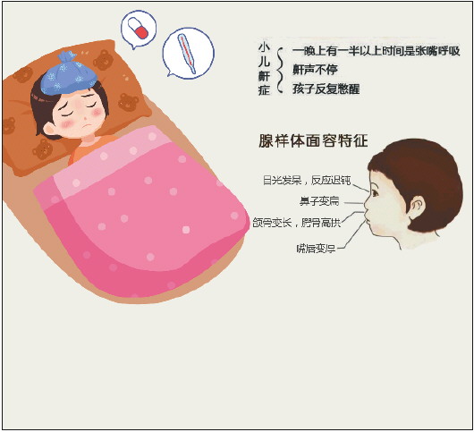 “由于呼噜娃长期张口呼吸,致使气流紊乱、面骨发育变形、上腭高拱、门牙突出、鼻梁下塌、唇厚、缺乏表情等,会出现所谓的腺样体面容。”赵秋良说,腺样体面容一旦形成,再矫正就不容易了。
