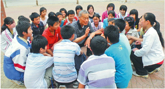 一件领子有破洞的衬衫、一双断了底的千层布鞋……简朴外表背后,是85岁的“布鞋校长”李振华对沂蒙山区学子长达68年的捐助。1953年,17岁的李振华从南京师范大学毕业后,来到山东沂源支教,每月捐出工资的1/4,一捐就是47年。1997年退休后,他只拿出500元用于生活开支,其余退休金全部捐出去。为帮助更多孩子,他还先后干过30多份兼职。截至去年,李振华累计捐款136万元,资助了2300多名学生。上图:李振华在淄博振华学校与受资助学生交谈。