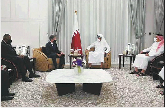 6日,在卡塔尔首都多哈,卡塔尔埃米尔塔米姆(右二)会见到访的美国国务卿布林肯(左二)和国防部长奥斯汀(左一)。