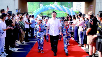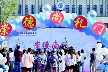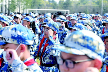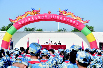 上午8点30分,六年级新生们身着迷彩服和老师们两两牵手,迈着矫健的步代,穿过象征希望与梦想的“崇德尚礼”彩虹门依次来到操场。此时,七年级、八年级、九年级的学哥学姐们早已在操场等候,他们用热烈地掌声欢迎学弟学妹们加入玉泉实验中学这个大家庭。