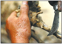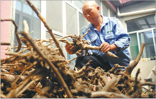 李良在堆积如山的荆轲树根中挑选适合的树根。