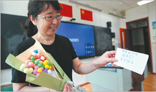 ▲教师节当天,董秀萍收到了学生制作的鲜花和祝福卡片。