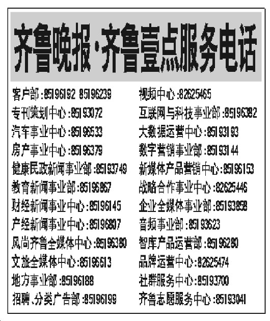 齐鲁晚报·齐鲁壹点服务电话   客户部:85196192 85196239   专刊策划中心:85193072   汽车事业中心:85196533   房产事业中心:85196379   健康民政新闻事业部:85193749   教育新闻事业部:85196867   财经新闻事业中心:85196145   产经新闻事业中心:85196807   风尚齐鲁全媒体中心:85196380   文旅全媒体中心:85196613   地方事业部:85196188   招聘、分类广告部:85196199   视频中心:82625465   互联网与科技事业部:85196382   大数据运营中心:85193193   数字营销事业部:85193144   新媒体产品营销中心:85196153   战略合作事业中心:82625446   企业全媒体事业部:85193858   音频事业部:85193623   智库产品运营部:85196280   品牌运营中心:82625474   社群服务中心:85193700   齐鲁志愿服务中心:85193041