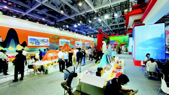 9月16日上午,虽然是工作日,但许多海内外的业内人士及文化爱好者仍迫不急待地第一时间到场参观。在3号馆的入口处,济宁展厅显得格外惹眼。与往届展会济宁展区恢弘庄重的风格略有不同,为了响应本届博览会主题“庆祝建党百年 共享盛世文旅”,今年济宁展厅的主色调是明亮的红色。展台的背景则是用鲜艳的颜色搭配,形成更具视觉冲击力的色彩效果,并组成抽象的山、水、古建、苍松劲柏等,寓意尼山、运河、大成殿等代表性地标。整体风格在保留了众多传统文化元素的同时,又更显青春时尚。
