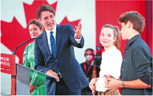 9月21日,特鲁多(左二)及家人出席自由党选举夜集会。 新华/路透