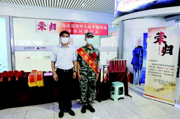 青岛市退役军人事务局局长孙宗子来到青岛火车北站的“返乡接待站”,为退役士兵戴上“荣归”红花。