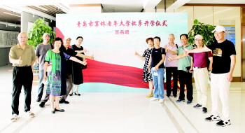 青岛市军休老年大学秋季学期开学,首批学员在签名墙前报到留念。周晓 摄