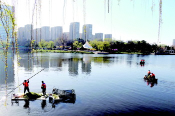 城区河道治理进入规范化阶段。图为环卫工人打捞河道漂浮物。